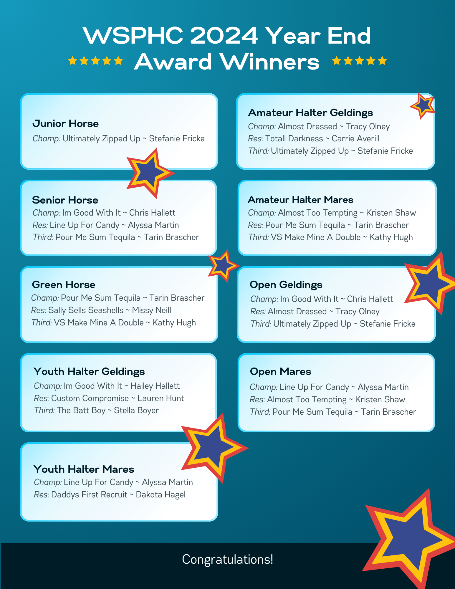 Our Year End Awards Program is easy to participate in – submit a WSPHC declaration form before your first show (NWCC-approved shows), work 4 hours at the Star Spangled Classic in July, and attend two meetings (most are via zoom). There is no cost to declare into the program.